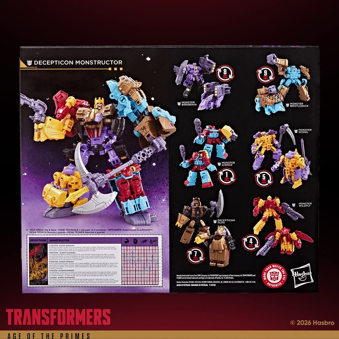 Hasbro is bringing the heat with the return of the legendary Monster Pretenders in Transformers: Age of the Primes. The fearsome Decepticon team—Birdbrain, Bristleback, Icepick, Scowl, Slog, and Wildfly—each transform from bot to beast before combining into the monstrous powerhouse: Monstructor.